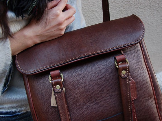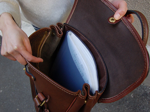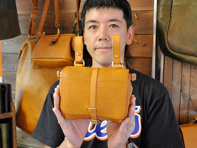取っ手は肩にも掛けられる長さです。現在イレギュラーな革を使い、