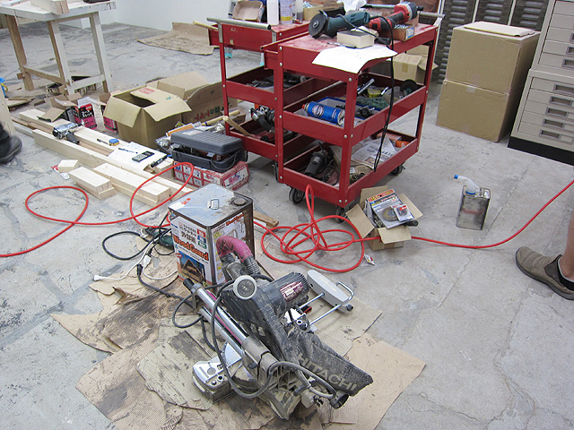 仙台店のみんなの様子はというと、只今鞄制作用の作業台を制作中。