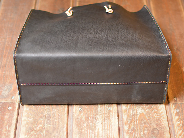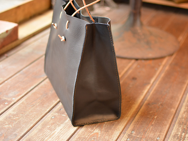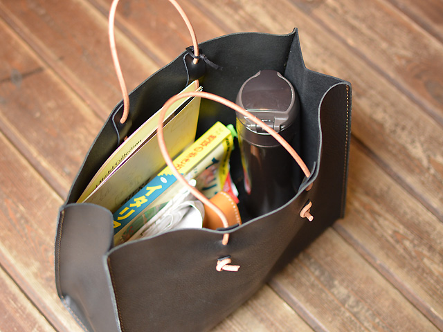 革は薄めのソフトレザーを使い、取っ手はカバンに仕舞う時に