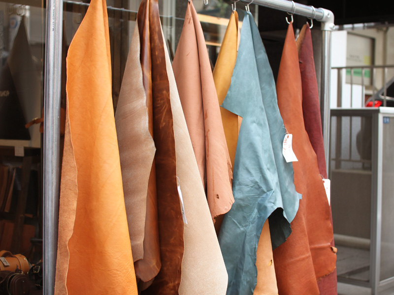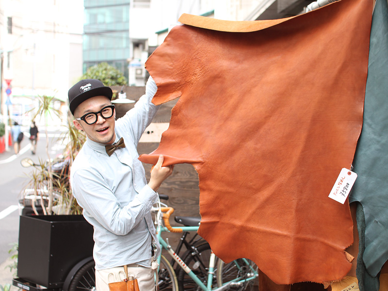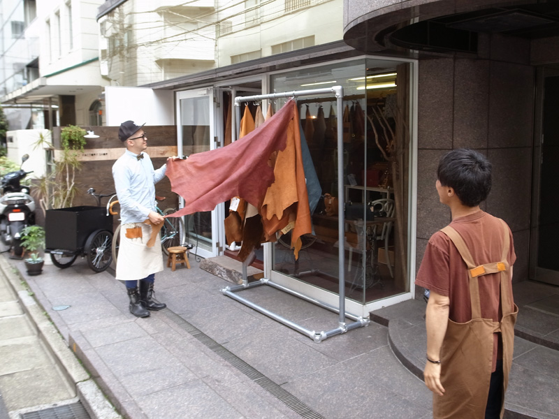 こんな感じで外に一枚革を吊り下げて販売しています。