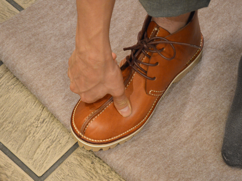 石口「長さに対して幅は細めに作ってあるんですが、ではもう一つ下のサイズも履いてみましょう。」