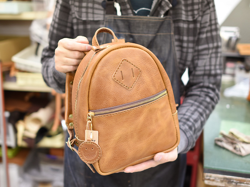 ※先の子どもポシェットとこちらのリュックはサンプルの革を使用しているので、