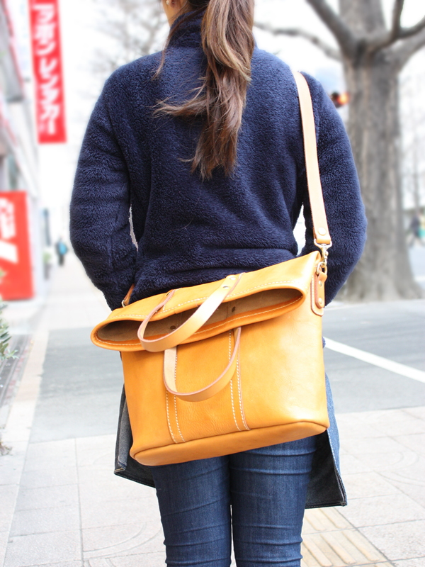 折っている状態でA4ファイルが入るサイズになっており、トートにすると容量が大きくなります。