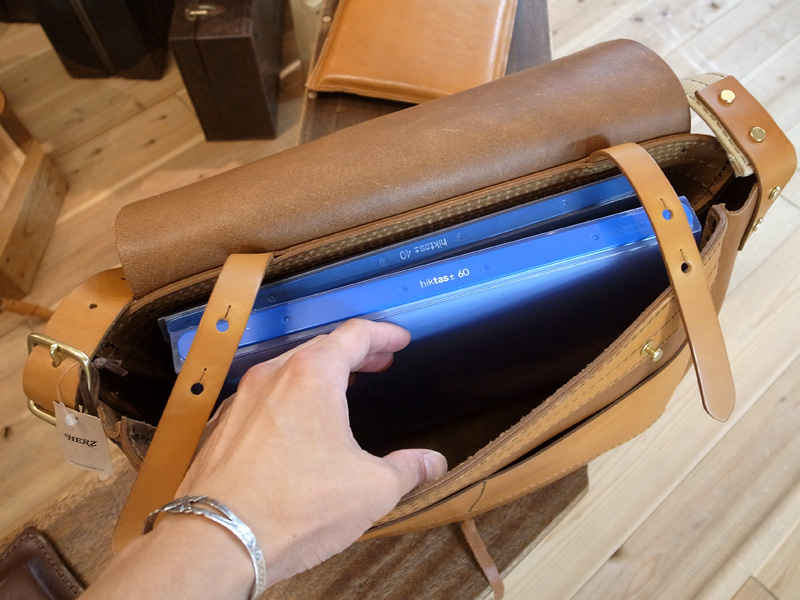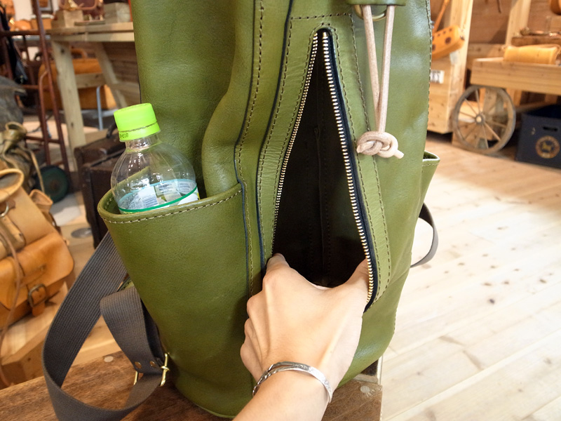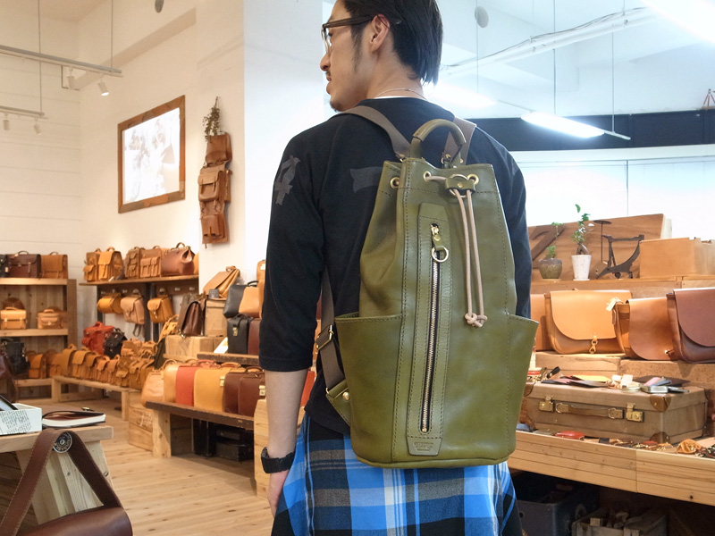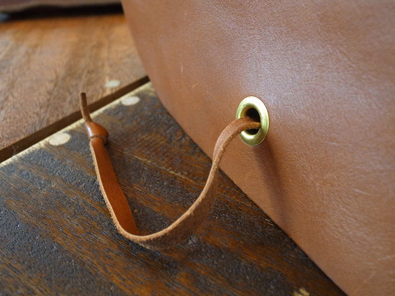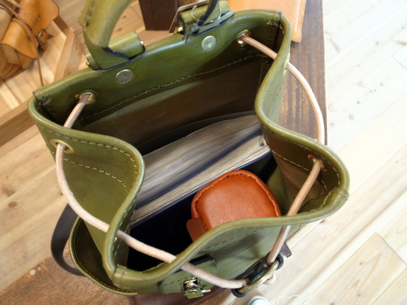 口の部分が創業者モデルのボンサック(W-1)のようになっていて、革紐で開け閉め出来るようになっています。