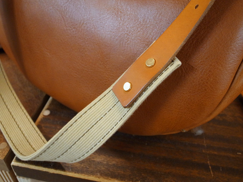 フタの部分を革紐で留めるところとショルダーベルトの一部が綿素材になっているのが印象的です。