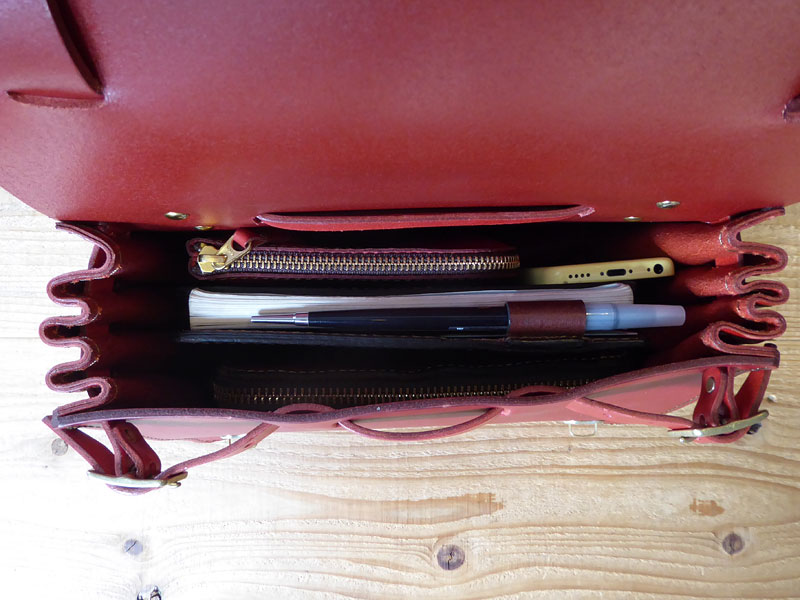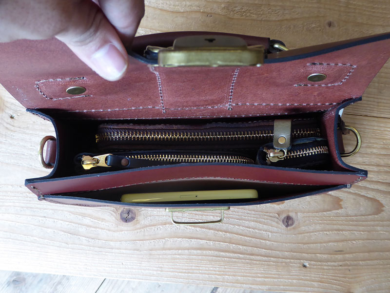 - 中には携帯、長財布、ポーチ、手帳、携帯、ペンケースが入ります。まだ少しの余裕はありましたね。