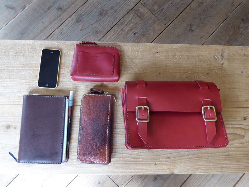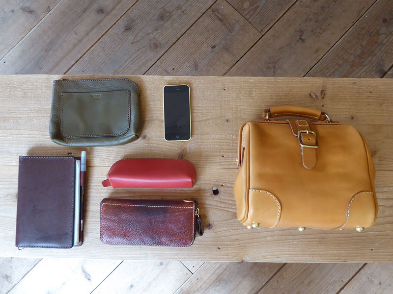 - ファスナーポケットには長財布、反対のポケットにはペンケース、名刺入れ、カードケース、携帯を入れています。