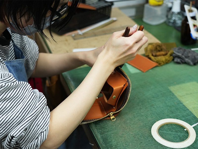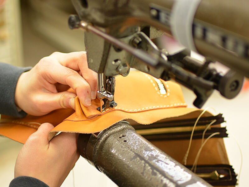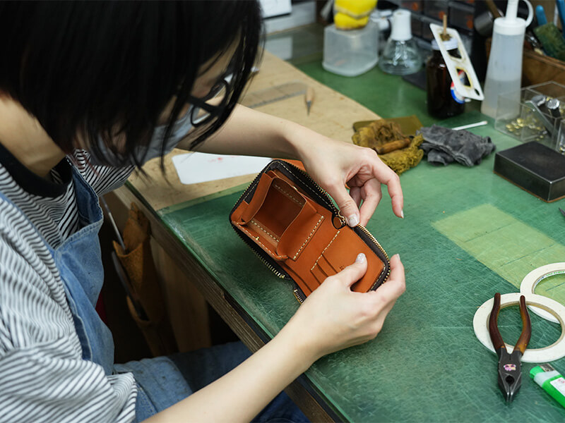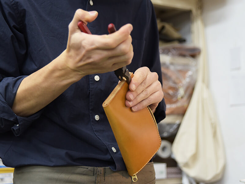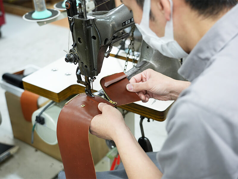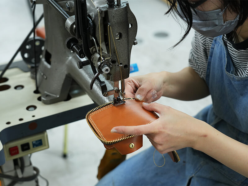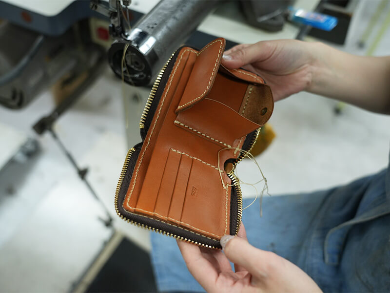財布の二つ折りファスナー財布(WS-40)は本体と中身を合わせる最後の縫製が難しいとのこと。