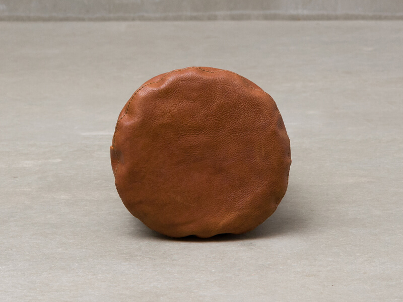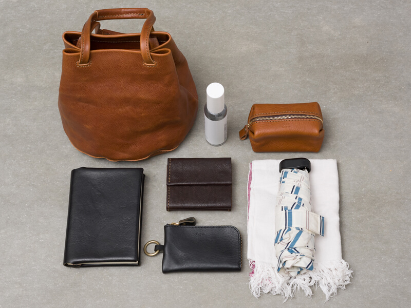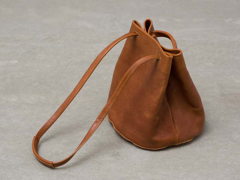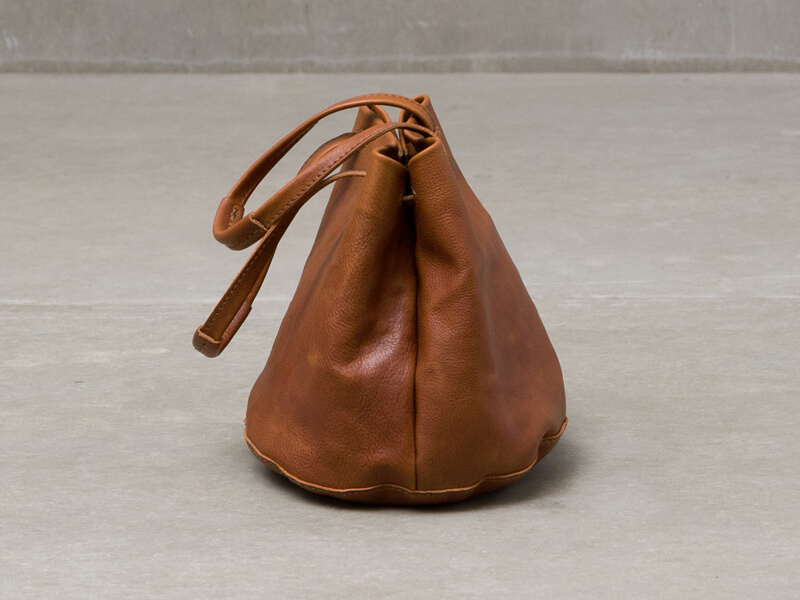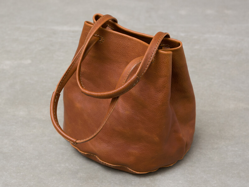 軽いイタリアンレザーユーフラテを使用した巾着型のトートバッグ。一枚革で仕上げた円形の底面と、手持ちに加え、肩掛けも出来る取手が特徴です。