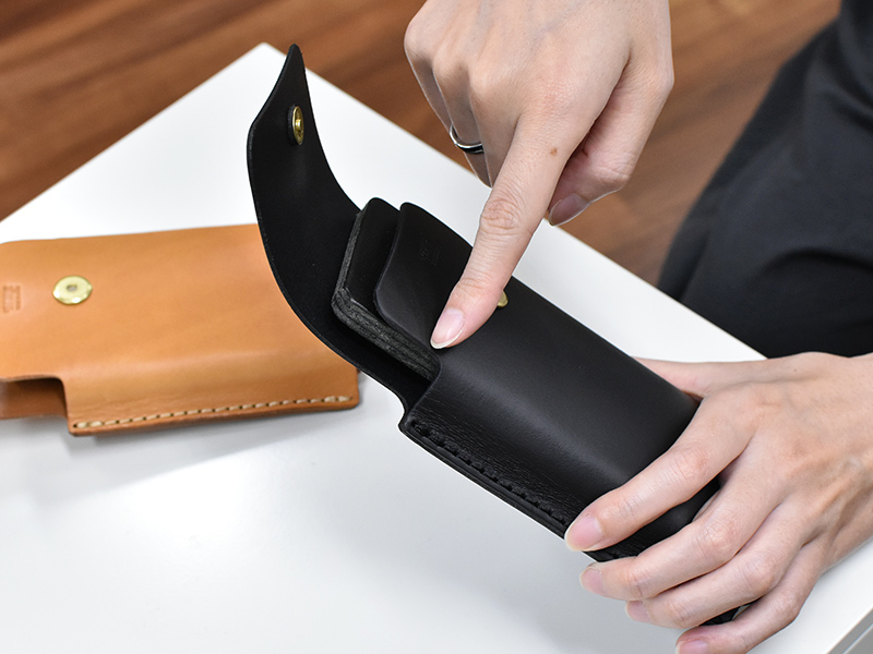 「マチ部分をくり抜いたところがこだわった所の一つです。実は最初はワンサイズだけで、いろんな大きさのスマートフォンに対応できるケースを作ろうとしました。でも大きいスマホに対応したサイズにすると、小さいスマートフォンが取り出しにくく、収納した際に埋れてしまったので、マチをくり抜いて取り出しやすくしました。」