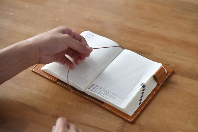 簡素な構造の中にもこだわった点があります。それはカバーにつけた革紐の栞です。