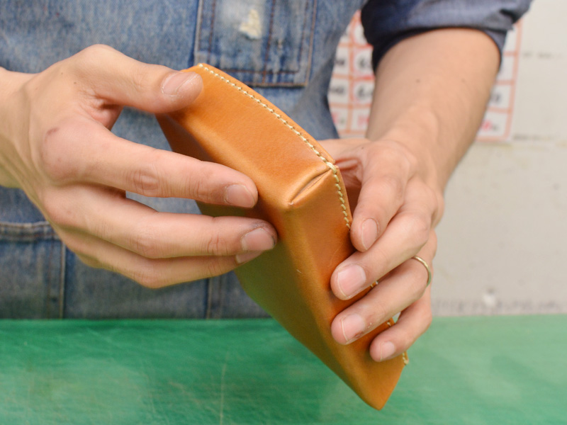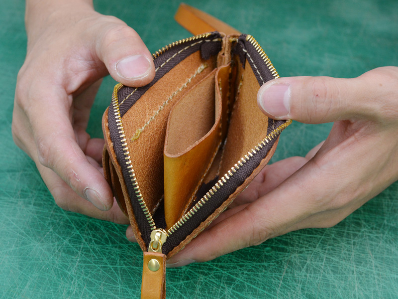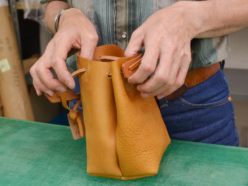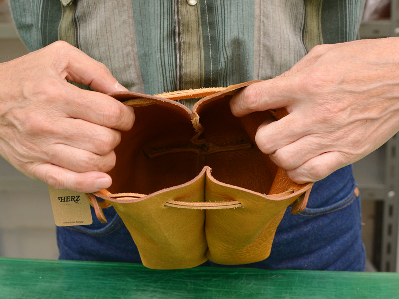 革紐の厚革部分は、手で持っても、革紐留めとして本体の方へ留めてもどちらでも自由に使えます。
