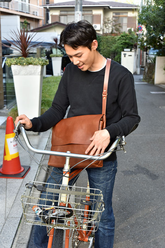 大きい鞄が好きな隆太郎はMサイズをセレクト。フラップを開けるだけで中の物にアクセスできる容易さが自転車乗りには魅力的。走行中、急に雨が降った時もフラップがついていることで、中が濡れにくくなるのも嬉しいポイントです。