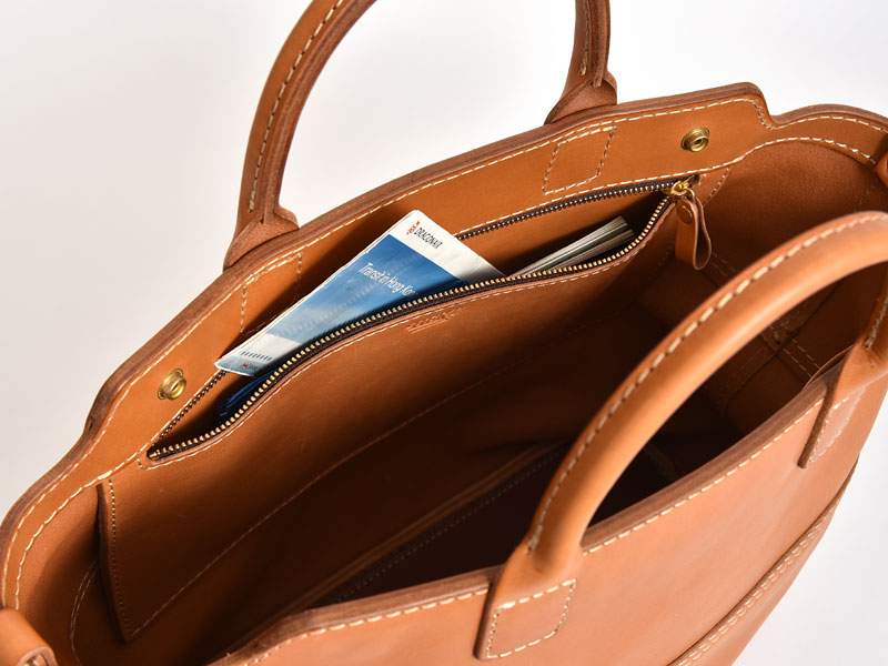 開け口が広く、仕事の荷物をざっくり入れたい方におすすめ。内側には大きな吊るしのポケットが両側にあり、片方はファスナーポケット、もう片方は仕切りポケットで細かい小物も分けやすくなっております。