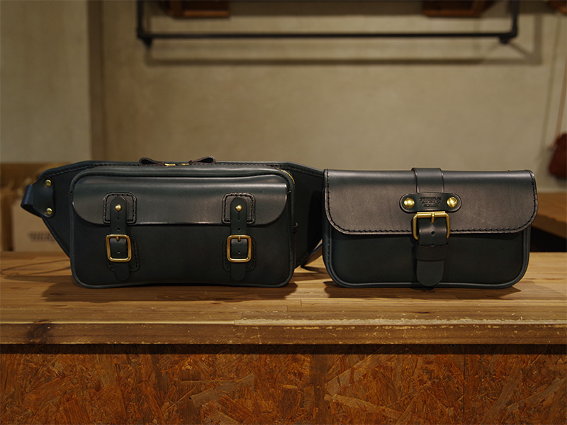 写真左:左からライダーボディバッグ(F-12)一本ベルトのクラシックボディバッグ(F-4)