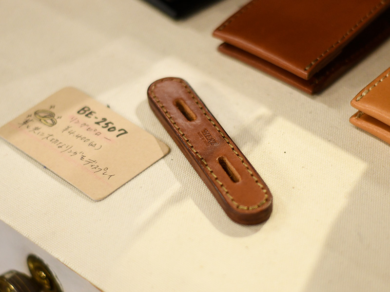 ベテランの作り手が初心に帰って手掛けたこのストラップ。クッション部分と一枚革の境目に「カシメが無い」のがポイント。それは一枚革がクッションの中まで入っていて耐久性を保っているためです。
