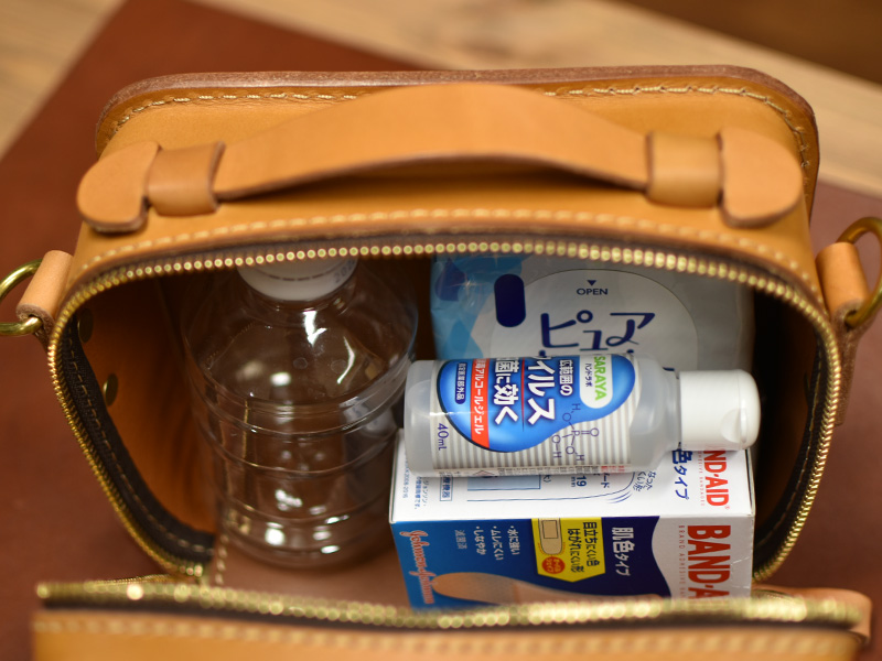 左の写真は280mlのペットボトルを縦に、ウェットシート、絆創膏、除菌用アルコールを入れています。