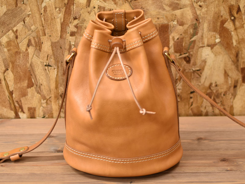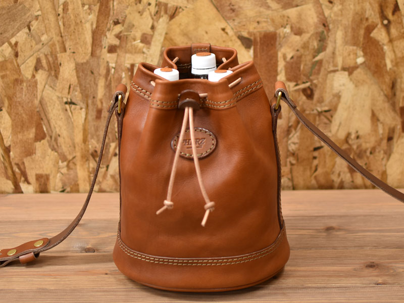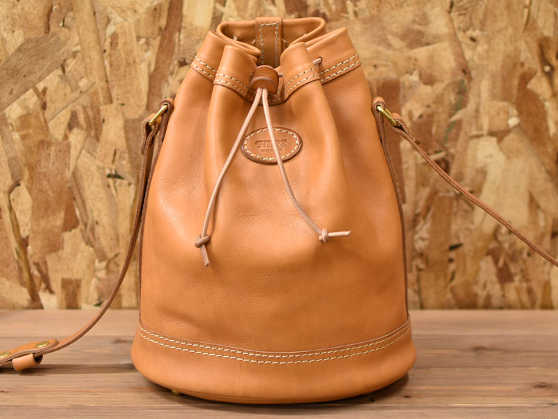 無駄な装飾を省いているので、シンプルながらも巾着部分の革の表情がユニークで、どこか特徴的な表情に。