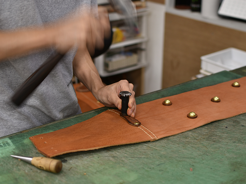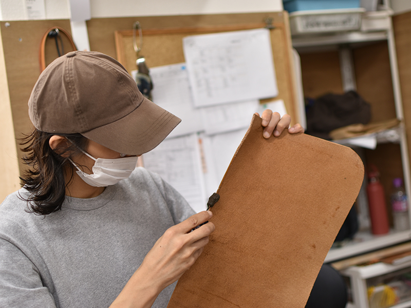 革を「漉く」作業。鞄の形を綺麗に出すために、重要な工程です。