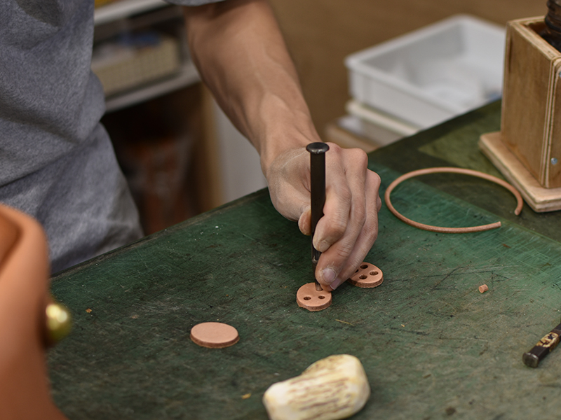 革のコバに丁寧に染料を入れているところ。