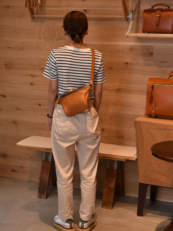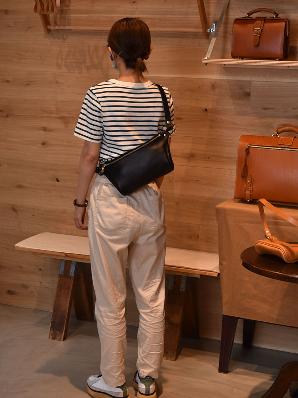 定番品のボディバッグたちと比べるとコンパクトな印象。横幅は長財布がちょうど入るくらいです。
