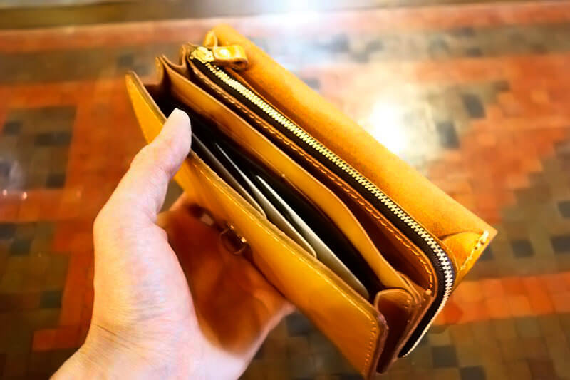 今回の企画で「仕切り付きの財布があったらいいな」と言う意見もあったので、作り手にお願いをしてこの形が出来上がりました。