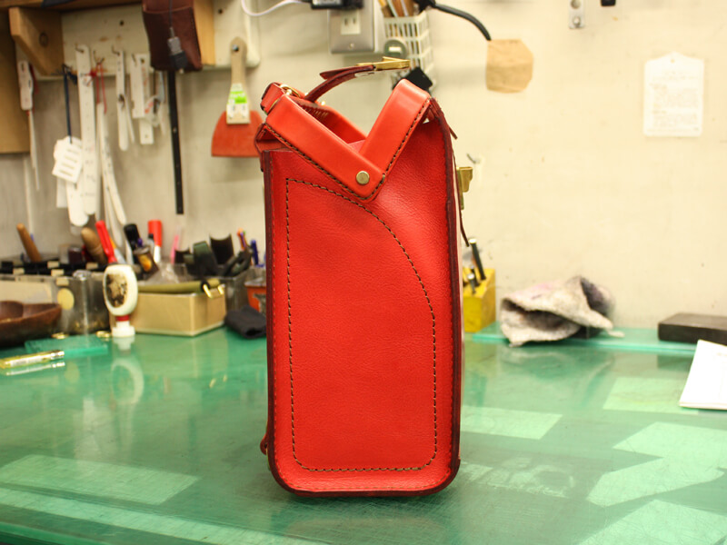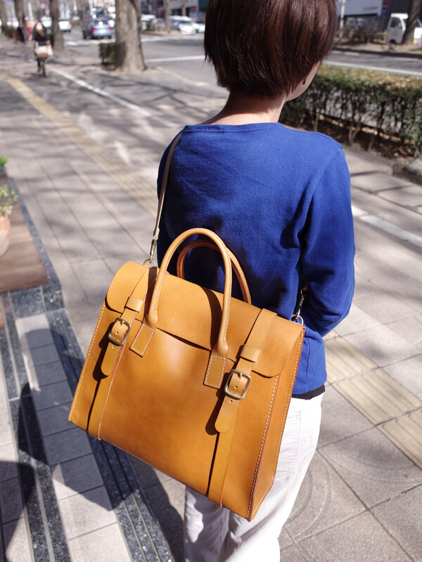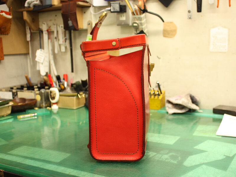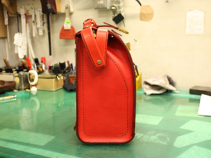 一昨年から取り組んでいるランドセル型口枠鞄の発展系で大人用横型通勤鞄を作りました!