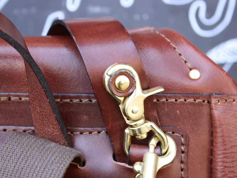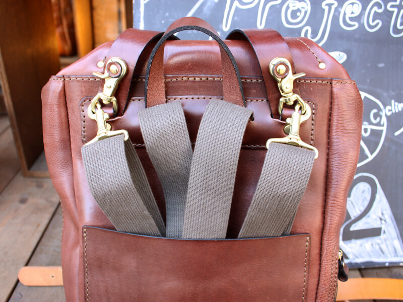 普通のリュックとして使う時はナスカンをカブセベルトについている革パーツに