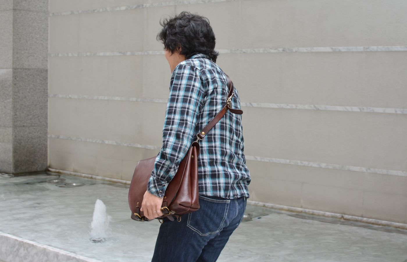 プロフィール 本店作り手:間所 「ミシンなど機械の整備なども担当している縁の下の力持ち。カメラを向けると絶対にポーズしてくれる。」 愛用品:ナレッジバッグ・KNOWLEDGE BAG(CW-137)MH 革色:チョコ 愛用期間:4年~Q. 使ってどれぐらい経ちますか? 4年くらい毎日の通勤で使っています。バイク通勤なので、雨の日も構わずにビショビショになりながら使っています。Q. 使い心地はいかがですか? バイク通勤の僕にはぴったりで、使いやすいです。いつもは、長財布・ペットボトル・お弁当、たまに書類や封筒を持ち歩いています。ある程度革に厚みがあるので、柔らかい書類が曲がらずに収納できるのは良かったです。この鞄はストラップを付け替えることでリュックにもななめ掛けにもなるんですが、僕は面倒くさがりでストラップを持ち歩いたりしたくないので、リュックストラップ2本をずらして取り付けてショルダーストラップとして使っています。これだといつでもリュックに出来ますよ!Q. メンテナンスはしていますか? 何もしていません。雨に濡れてビショビショになっても何もしないので、気づいたら蓋の革がものすごく硬くなってしまいました。僕の場合は過酷に使ったらどうなるか知りたかった部分もあるので良いのですが、やはりオイルメンテナンスはした方が良いと思います。(笑)
